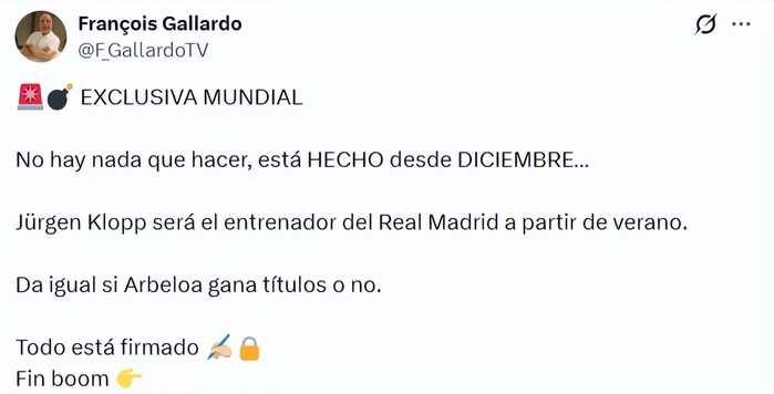 除了有可能签下恩佐外,西班牙媒体还带来了更加劲爆的消息。西班牙六台记者François Gallardo报道,克洛普确定将于今夏执教皇马。这名记者记者还用“尘埃落定”来形容克洛普执教皇马,甚至说“”一切文件都已签署”。不得不说,他的这个报道确实非常劲爆,但其真实性却也无法判断。尤其François Gallardo的“历史战绩太过辉煌”,他的报道基本就没准过。